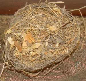 No such luck. Dad removed the nest (and a dandy it is). Still lots of problems. Relocating the nest to my living room didn’t solve a thing aside from a decorating dilemma.