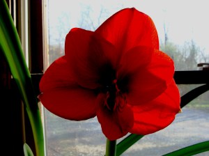 I mentioned that you have to be tough to live in The Barn; and, it seems, amaryllis bulbs thrive on toughness.  For the past few years, one of the two amaryllis bulbs has produced blooms.  In fact, the second bulb was an off-shoot of the first and I didn’t expect it to ever do much of anything it was such a small and puny thing.  Indeed, both plants look awful most of the year and I only keep them around for the February/March spectacle of blooms.