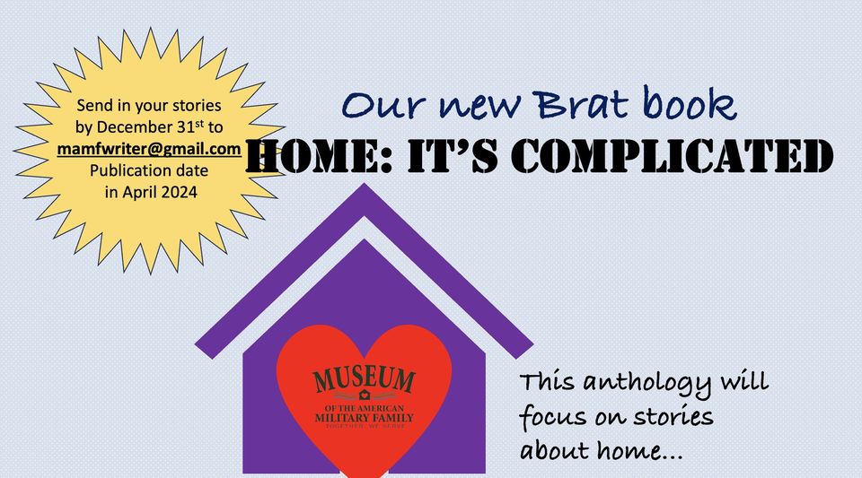 Connie Kinsey, the Museum of the American Military Family and Learning Center’s Writer-in-Residence, is pleased to put out a call for stories for our newest anthology “Home: It’s Complicated.” Where is “home” to a Brat? What makes home a home? What does it feel like to “move home” or “leave home”? Is home a person, place, or thing? This topic is timely–we at the museum are asking this same question for ourselves! Later this week we will post further details on the project–but for now, sharpen your pencils, warm up your laptops, and think about home