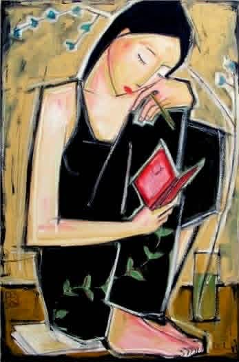 I’m looking at an image by Canadian artist Denis Chiasson.  I see with an old woman’s eyes now.  The image is not as clear as I need it to be to discern if she is holding a pen.  I choose to think she is.  I also choose to believe she is reviewing a card she just inscribed for someone.  Perhaps to accompany a gift.