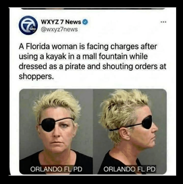 So, perhaps you can imagine my delight when I ran across the (fake) news story of a Florida woman who dressed as a pirate, complete with an eye patch, drove to the mall, dropped a kayak into the fountain, got in the kayak, and hollered “Ahoy me maties” and “Surrender your booty” at passing shoppers.