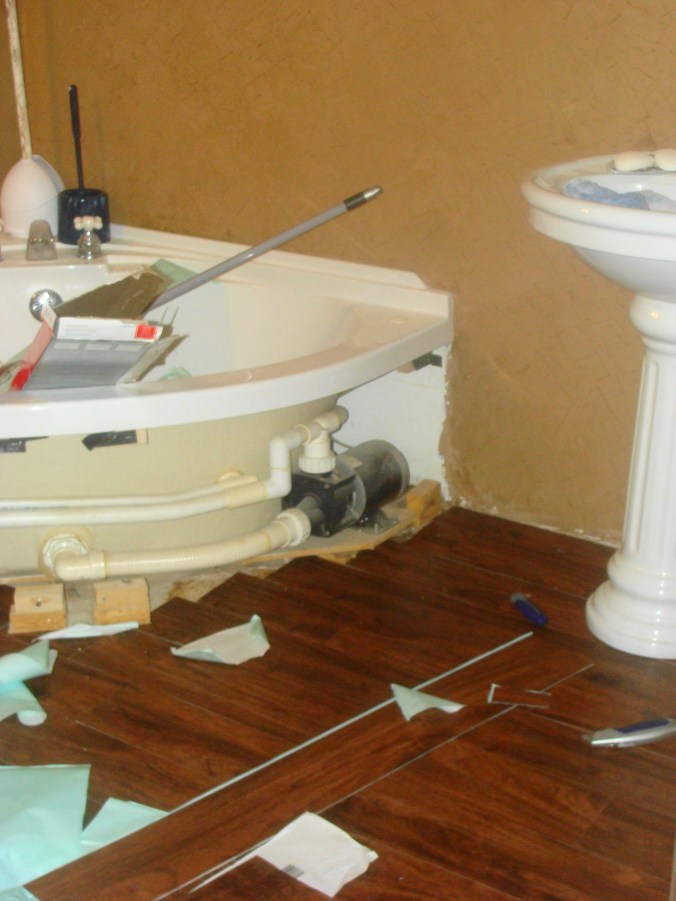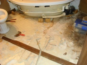 One heavy-duty cleaning was more than that old floor could take. It gave up the ghost, shriveled, unstuck itself from the subfloor (in parts) and crumbled (in other parts). After a stream of profanity and the lobbing of a coffee cup, I resigned myself to pulling up the old flooring. Of course, only parts of it would pull up. The remainder was stuck to the floor like bread calories on my hips. Fused. Welded. Married. Not-to-be-divorced.