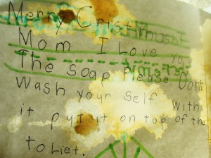 I spent the next day wrapping and finishing the trees. And cleaning. In the course of such, I found an old Christmas card from my son. This card had accompanied my gift of bath salts lovingly nestled in a baby-food jar and adorned with a fabric topper. The card is a dandy.
