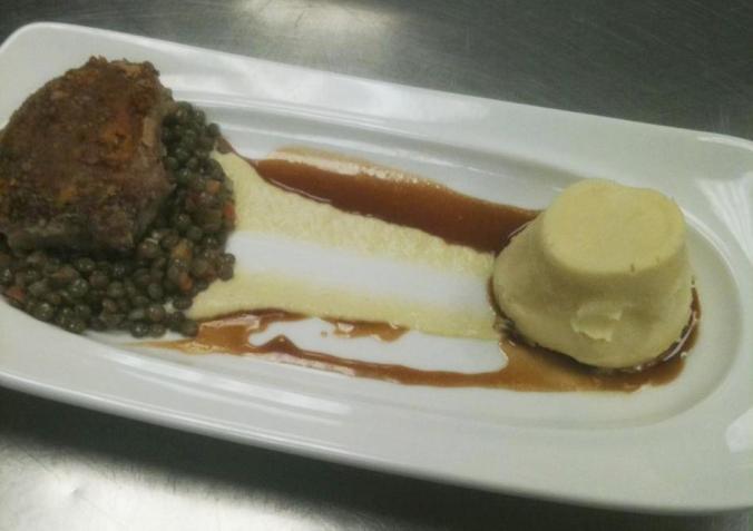 Braised and crispy fried pork cheek, leek puree, warm lentil salad, microwave brioche and smoked ham hock jus.