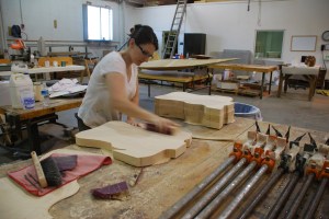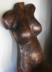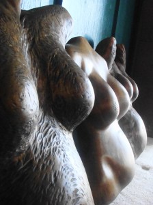 The three women are carved balsa wood. Layers of balsa were glued together (laminated), cut and carved. At my request, they were heavily textured and stained the same color as my woodwork and most of my furniture. I wanted them to slide into this house like they’d always been here and to appear as if they’d organically grown with the barn on this hillside. And they have.
