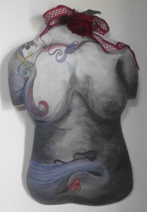 Some years ago, I whined and pleaded my way into another piece of art featuring the torsos of three women (Artist: Sherri Weeks.) The multimedia piece has hung in my study for several years now and I never tire of looking at it. In anticipation of the Maiden Mother Crone arrival, I have been preparing the study for installation which has involved a thorough gutting, cleaning, wall repair, dithering about color, and the application of 8 million coats of paint. I have whined.