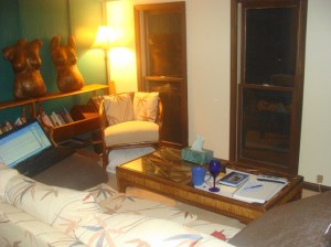 So the couch is becoming a favorite. I inherited it from HMO’Keefe who inherited it from his inlaws. It’s a beautiful rattan affair – part of a whole suite of furniture. We know what a furniture junkie I am. I particularly like old furniture with happy vibes. This stuff fits the bill. It’s what you’d call Florida room furniture. At the pied `a terre, we had it in the sunroom where it seemed the room had been made for it. When it came time to move out, there was consternation as to what to do with it. Between Boston Boy and myself, we have 4 sofas none of which we’re willing to part with. So there was a lot of moving stuff around and when it shook out, the guest bedroom turned into Doug’s mancave, my study lost the old library furniture which went to Doug and the rattan furniture came in here. This will create a crisis when one of the younguns comes to visit, but I’ll worry about that later. (I really do think the offspring ought to have a bed to sleep on during their infrequent visits.)