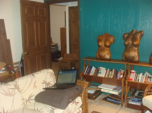 So I have the rattan furniture in here and a giant piece of bamboo my dad brought home from Vietnam. I have the Maiden Mother Crone triptych of torsos and the Maiden Mother Crone painting. My art supplies are stacked here and there and the books are all boxed pending getting the mess downstairs straightened out and replacement shelving installed. My rolltop desk has not been toted up the stairs yet as I can’t do that by myself. Under normal circumstances, the broken zen of this room would grate like the Chef du Hashbrowns at the Waffle House, but this room is the best one in the house right now. Comparatively, it’s an Appalachian beach of treetop calm.