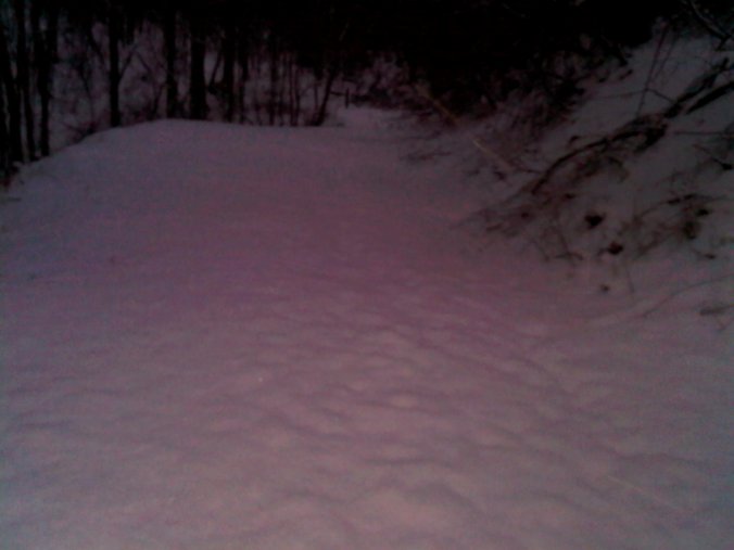 The old barn route is longer, but a far more picturesque route – unfortunately all I had with me was the cell phone camera. The evening constitutional was as pleasant as circumstances allowed – the backwoods teeming with deer. The neighbor’s German shepherd kept me company. It was kind of peaceful – pity the windchill kept me from coming in here, grabbing the camera, and returning to that long and winding road.