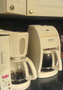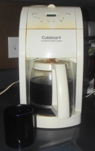 Yesterday, on Facebook, a friend happened to mention that she’d gotten a brand new Cuisinart coffee pot and did I want her old one which was a snazzy red. I told her no, because I have a snazzy white Cuisinart albeit an older model.