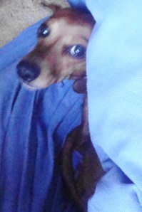 The puppies are nestled in Cadillac of Dog Beds. Was my braving the perils of the Beelzebub of Bobbinhood a tempting of fate? Or Be Prepared? I also had a full tank of kerosene.  [I guess some of that Girl Scout training sunk in aside from over-packing for vacations and business trips.]