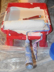 After two weekends of painting prep, I got the paint out yesterday. It took all flippin day to do about 20 minutes worth of ceiling painting. Tonight, I girded my loins, told my back to shut up, and set to. Three hours later, I have one coat of primer on the ceiling. I’m figuring on two coats of primer and two coats of color. It’ll be years before I’m done.